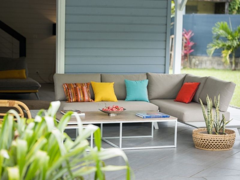 • 1 terrasse couverte tout autour de la villa, avec un espace repas, un coin apĂ©ro, et des coins dĂ©tente Ă©quipĂ©s de hamacs